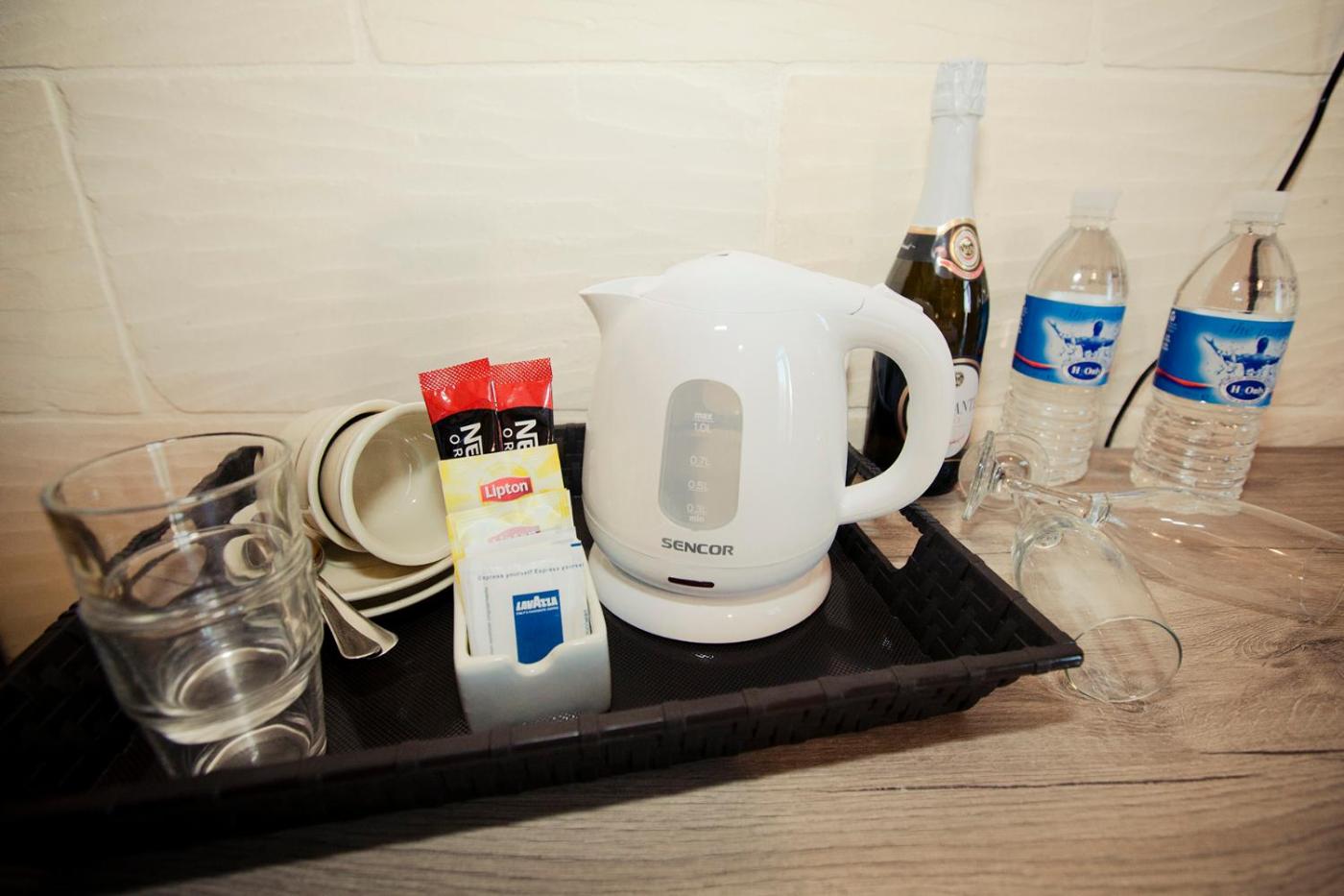 Deluxe Double Room. The double room offers air conditioning, soundproof walls, as well as a private bathroom boasting a walk-in shower and a hairdryer. The double room features a tea and coffee maker, a wardrobe, a tiled floor, heating, as well as a flat-screen TV with satellite channels. The unit has 1 bed. ;